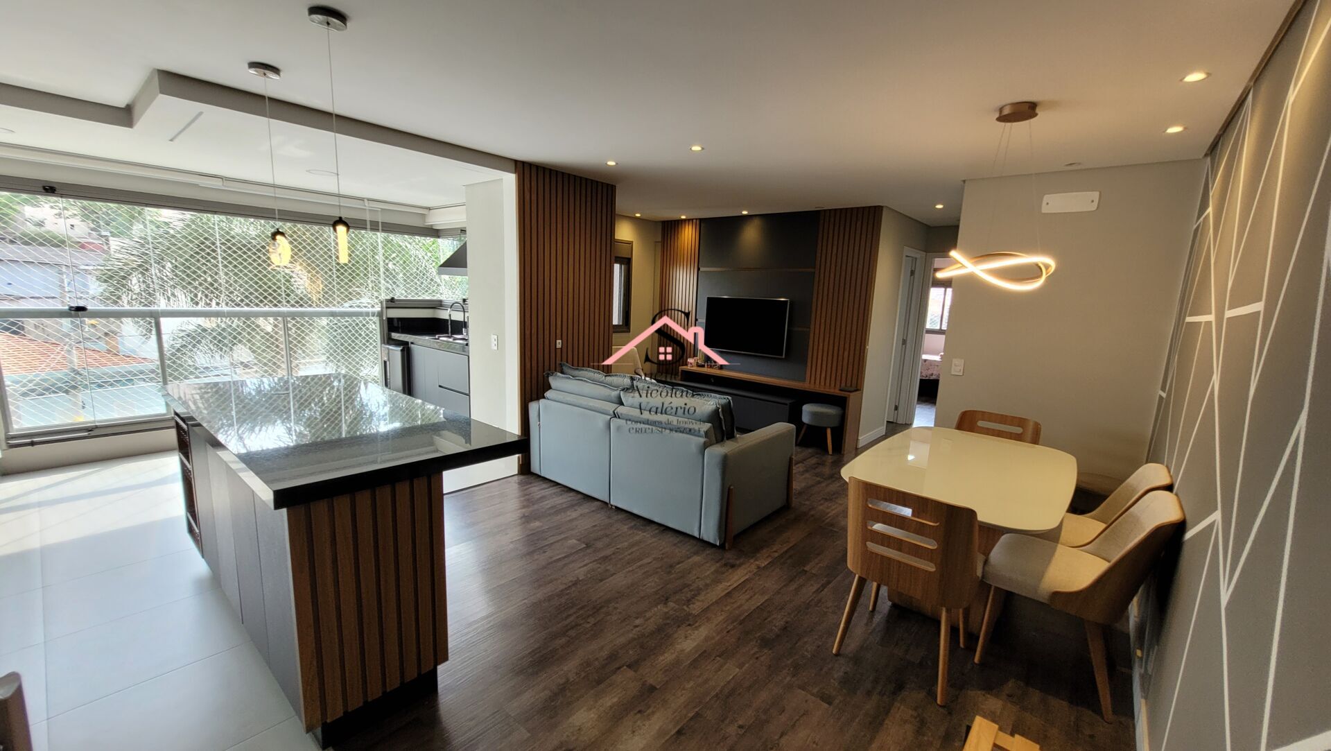 Área gourmet integrada a área de serviço, cozinha, sala de jantar e sala de estar